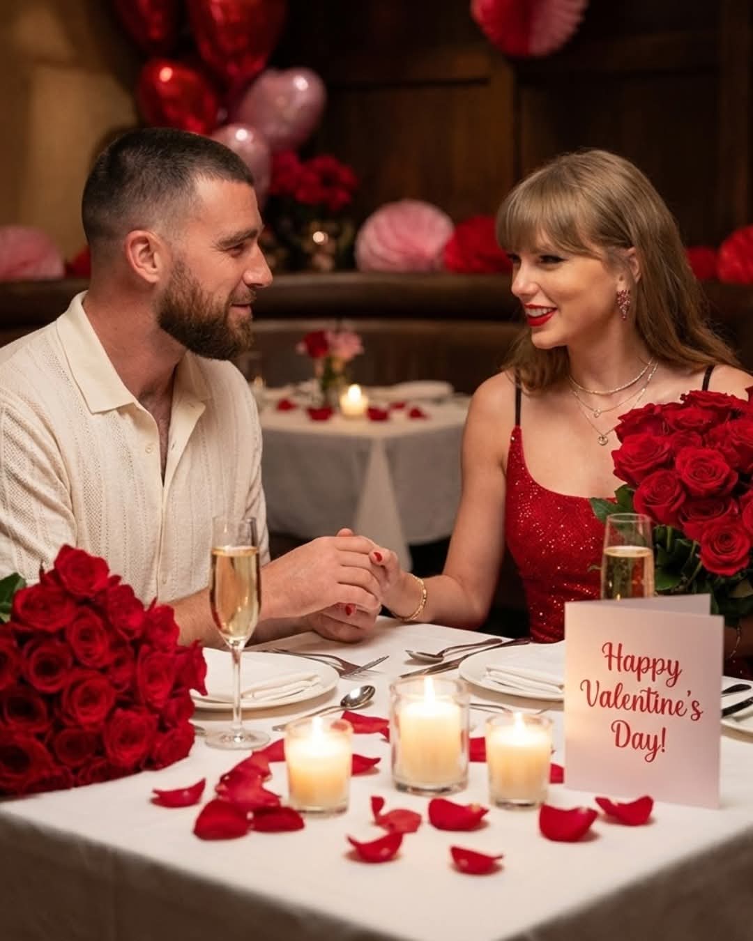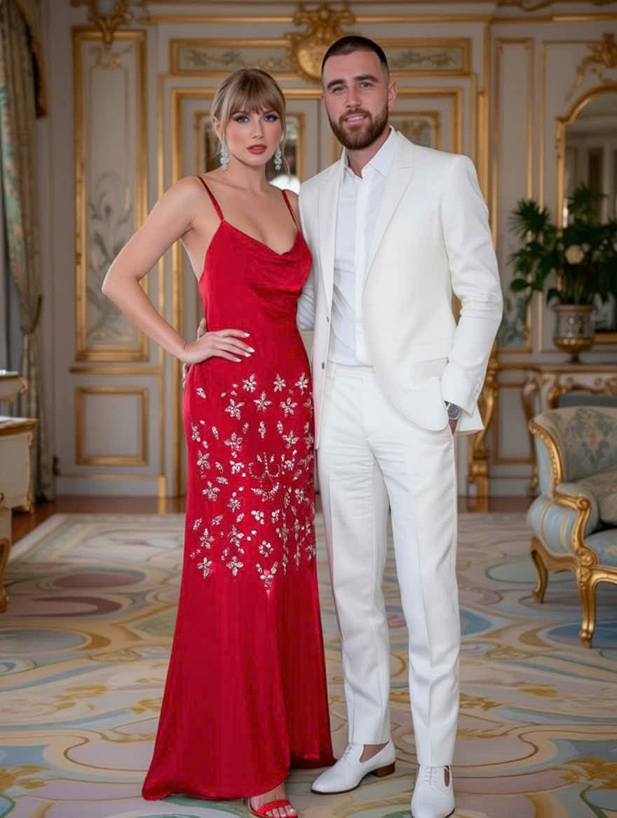 Travis Kelce and Taylor Swift appear dazzling in striking white and red outfits, presenting a glamorous and captivating couple in a luxurious setting.