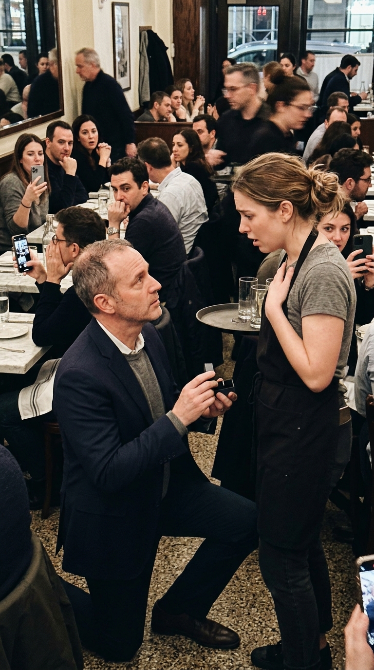 Right in the Middle of a Busy Manhattan Dinner Rush, a Billionaire Suddenly Dropped to One Knee and Proposed to a Shocked Waitress in Front of Dozens of Strangers — But the Quiet Words He Whispered Next Revealed This Was Never a Romantic Gesture at All