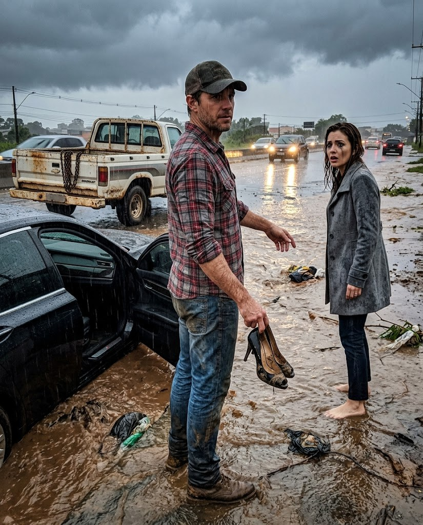 About twenty yards ahead, near the flooded shoulder by Marginal Tietê, a black luxury sedan sat tilted at an angle, one side half-sunk in mud. The driver’s door was open. A woman in a sharp gray coat stumbled out, one heel buried so deep in the muck it looked like the road was trying to drag her under.